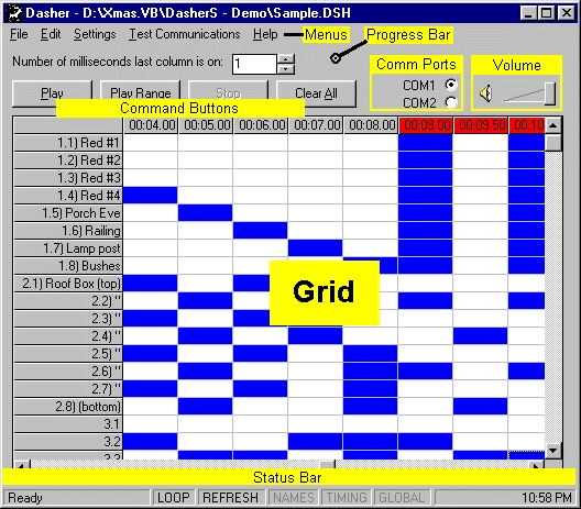 This is where you tell Dasher which lights to turn on or off. If a cell is highlighted that means the channel is on. If a cell is not highlighted the channel is off. Simply click on the cell in order to change it.